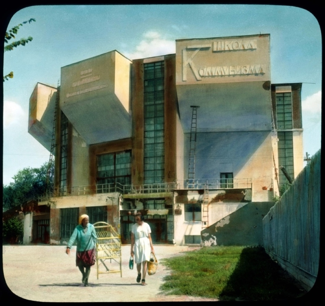This building, another workers’ club, was designed by Constructivistarchitect Ilya Golosov in 1926. Completed in 1928, the building incorporates several Constructivist principles, including its clearly delineated geometry and an embrace of advances in technology and engineering. The building is anchored by a glazed cylinder crisscrossed with a perpendicular plane, which hides a grand staircase. The relationship between the roundness of the cylinder and the sharpness of the angular elements gives the structure a dynamic quality evocative of the paintings of fellow Constructivists like El Lissitzky. Inside, several meeting rooms and an 850-seat theater served as spaces for education, entertainment, and assemblies. Even today, the Zuev Workers’ Club retains its original function as a cultural center, serving as home to a children’s and comic theater.