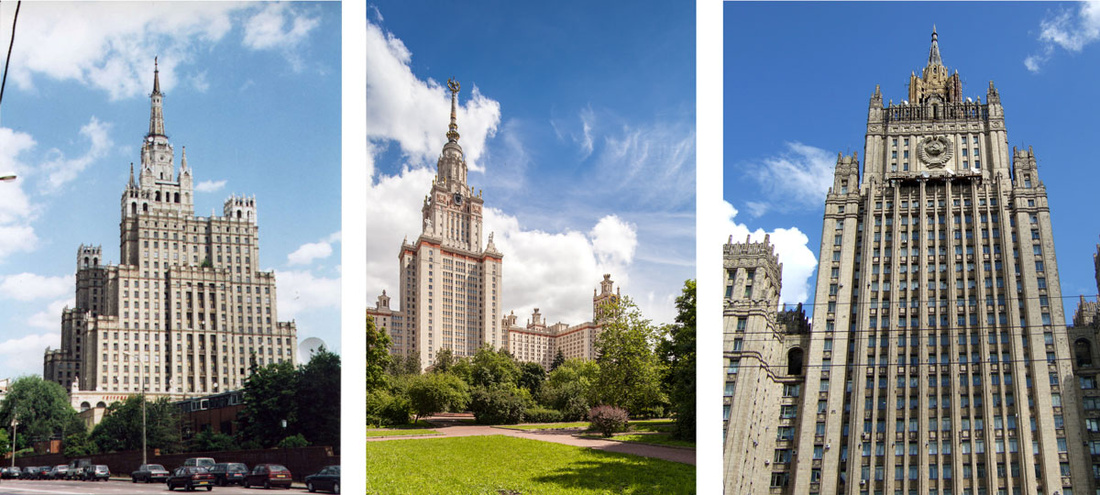 Left: Kudrinskaya Square Building. Photo by Jamie Barras, via Flickr; Center: Moscow State University. Photo by Sergey Norin, via Flickr; Right: Ministry of Foreign Affairs. Photo by Gioconda Beekman, via Flickr.