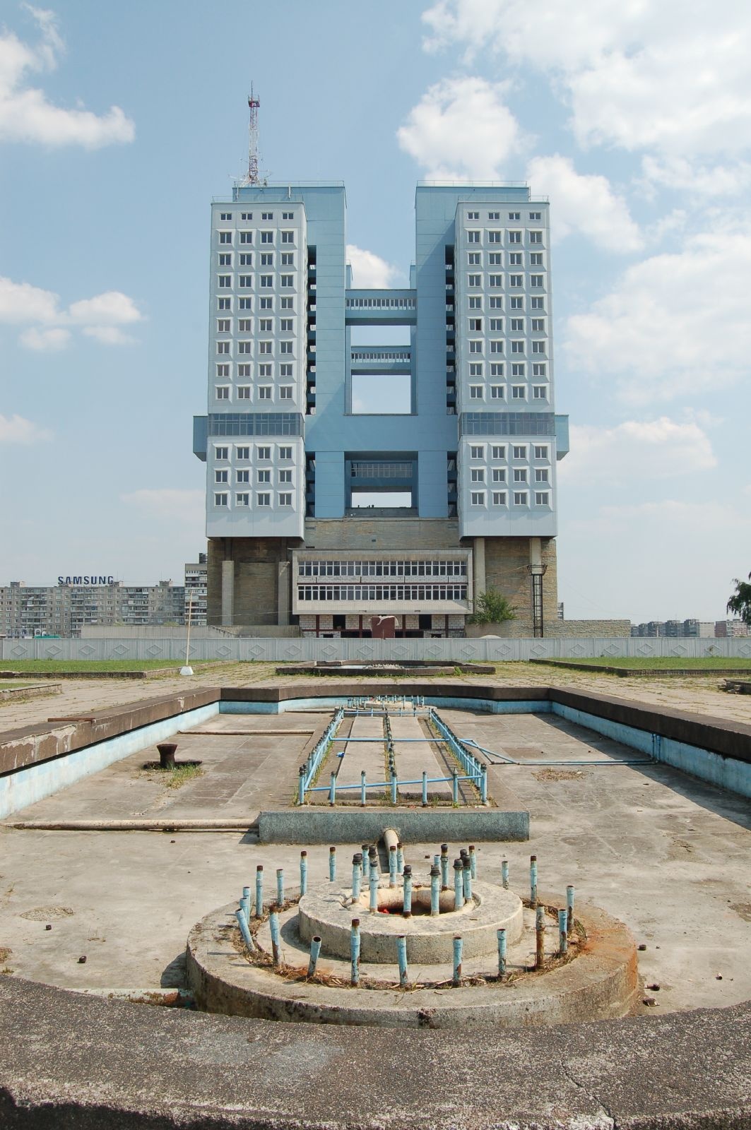 Like Tatlin’s Monument to the Third International, the House of Soviets was also designed to take the place of a former seat of the monarchy—in this case, Königsberg Castle in what had once been East Prussia. The castle suffered extensive damage after being bombed during World War II, so when Kaliningrad was absorbed into the USSR after the war, the Soviets used the opportunity to transform the site into an administration building for the region. Originally, in the 1960s, the building was planned to be 28 stories tall, though its weak foundations only allowed for 21. Further construction woes forced construction to a halt in 1985, with the building still unfinished; today, the House of the Soviets is just an empty shell, having never been completed or put to use. Locals endearingly refer to it as “the buried robot,” a reference to its rectilinear form and mechanical visage.